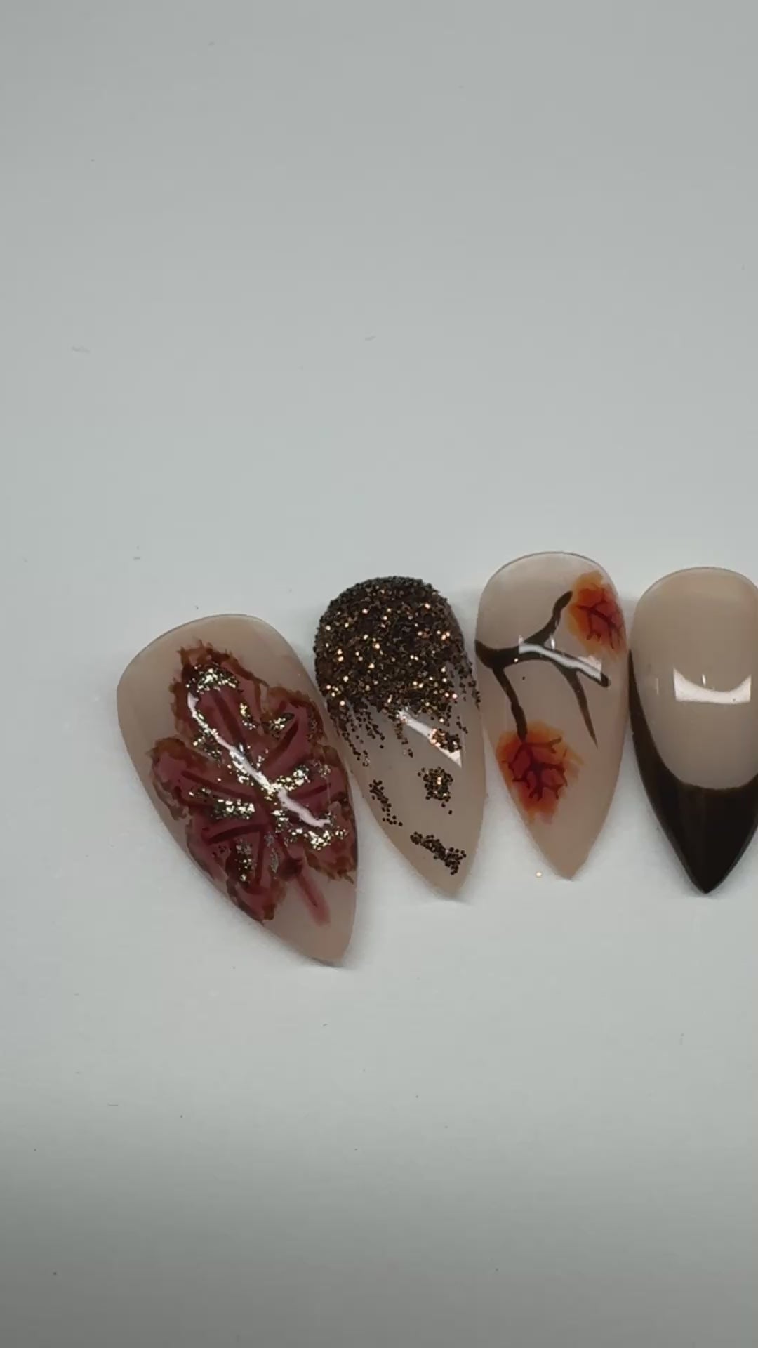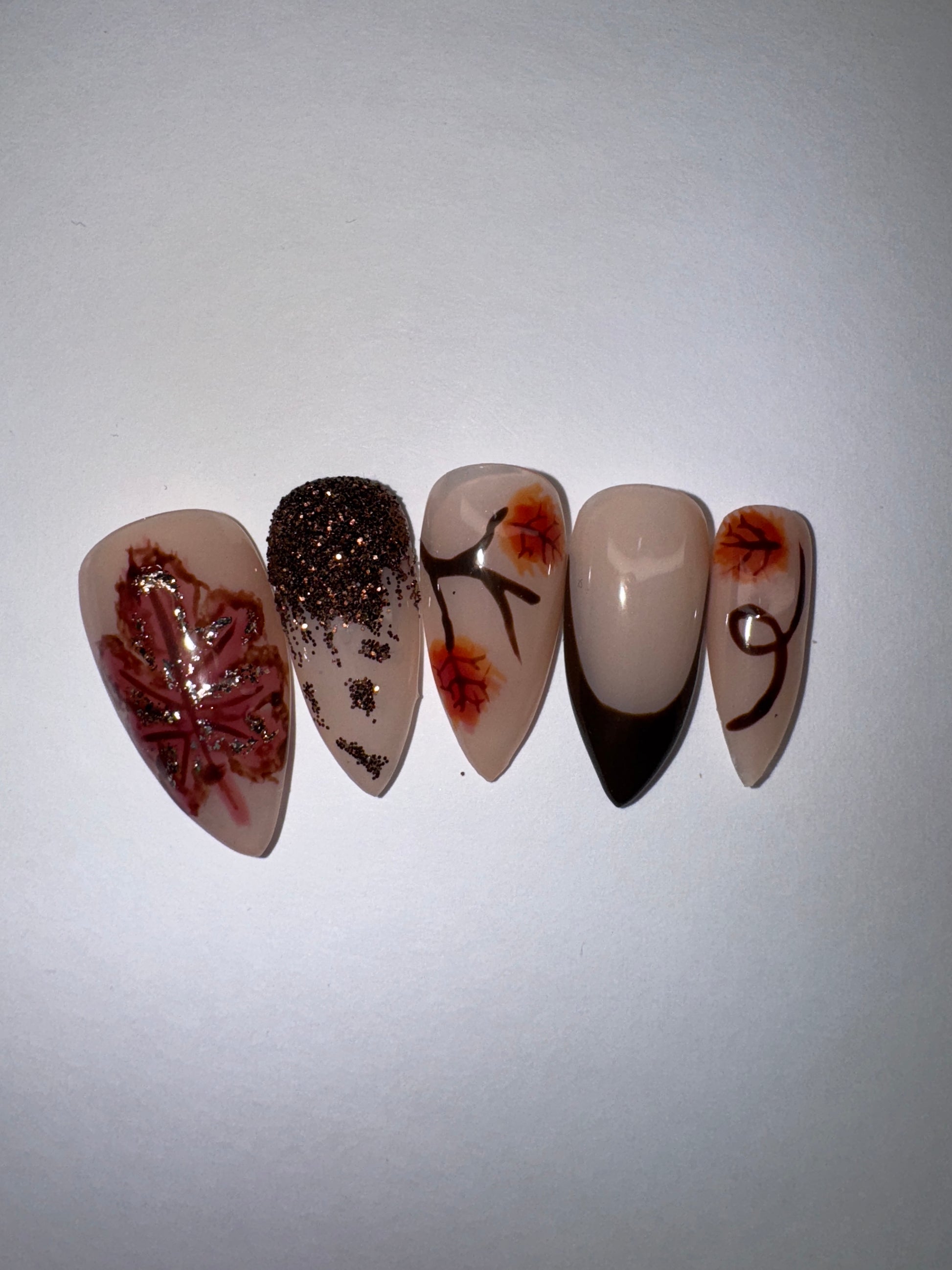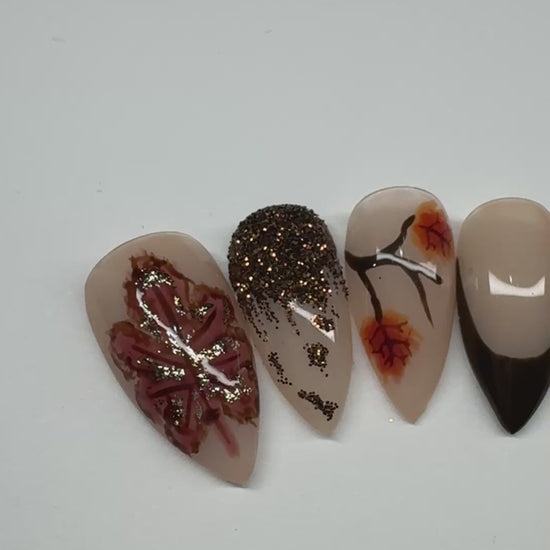 Step into a golden-hour daydream with Enchanted Autumn, a soft-neutral press-on set kissed with bronze glitter and delicate hand-painted leaves.
