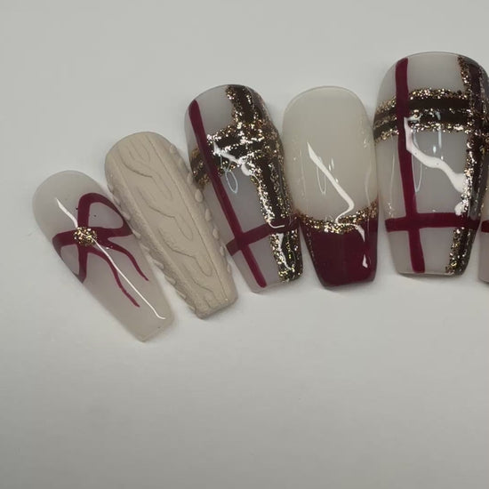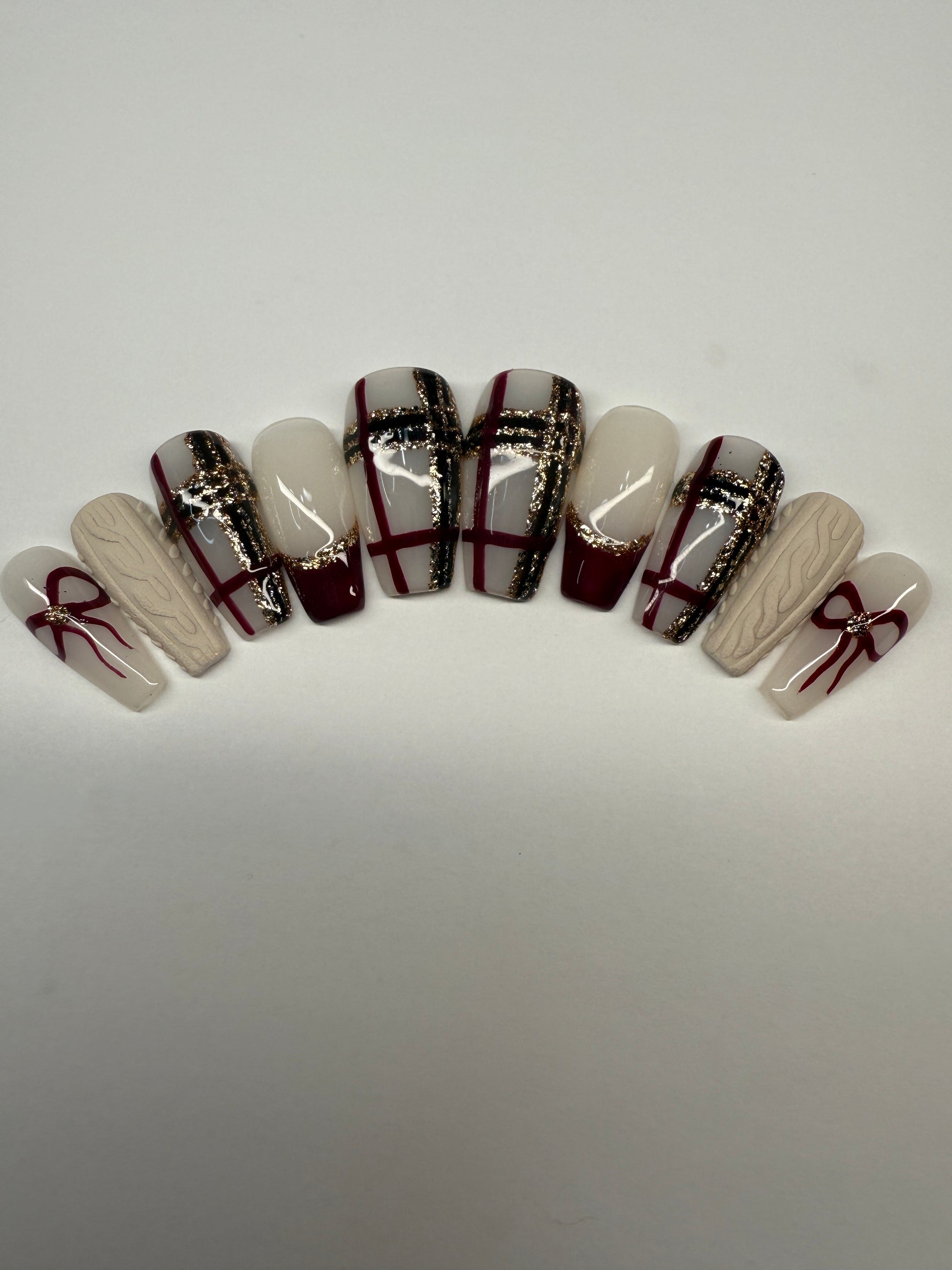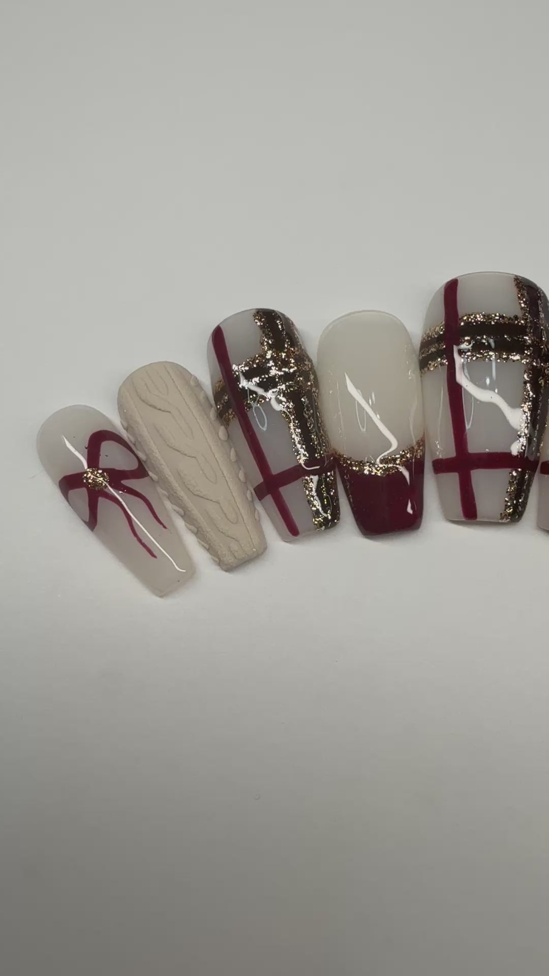 Holiday in Bordeaux mixes rich wine reds, bougie gold foils, and soft vanilla sweater textures to create the ultimateDecember flex. She’s classy, cozy, and a little bit smug… because she KNOWS she’s the best-looking set in the room.