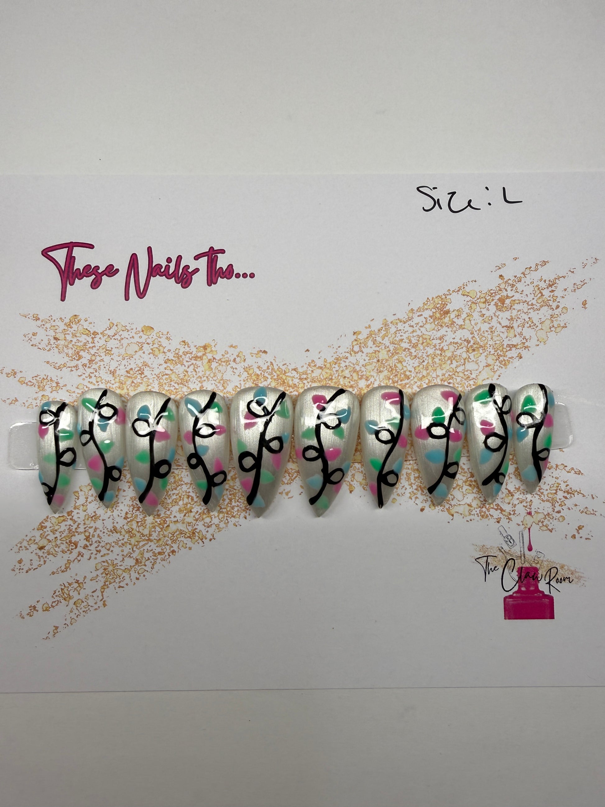 Featuring a pearly white base wrapped in hand-painted Christmas lights with pops of pink, teal, and green, this set already slaps… but flip off the lights and suddenly you’re the brightest thing in the room.