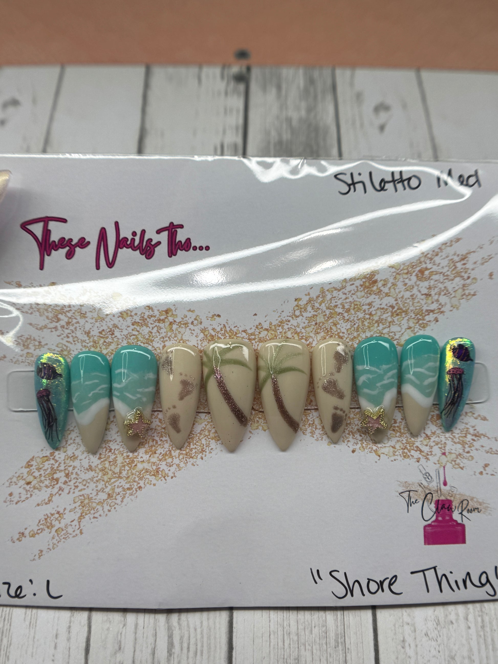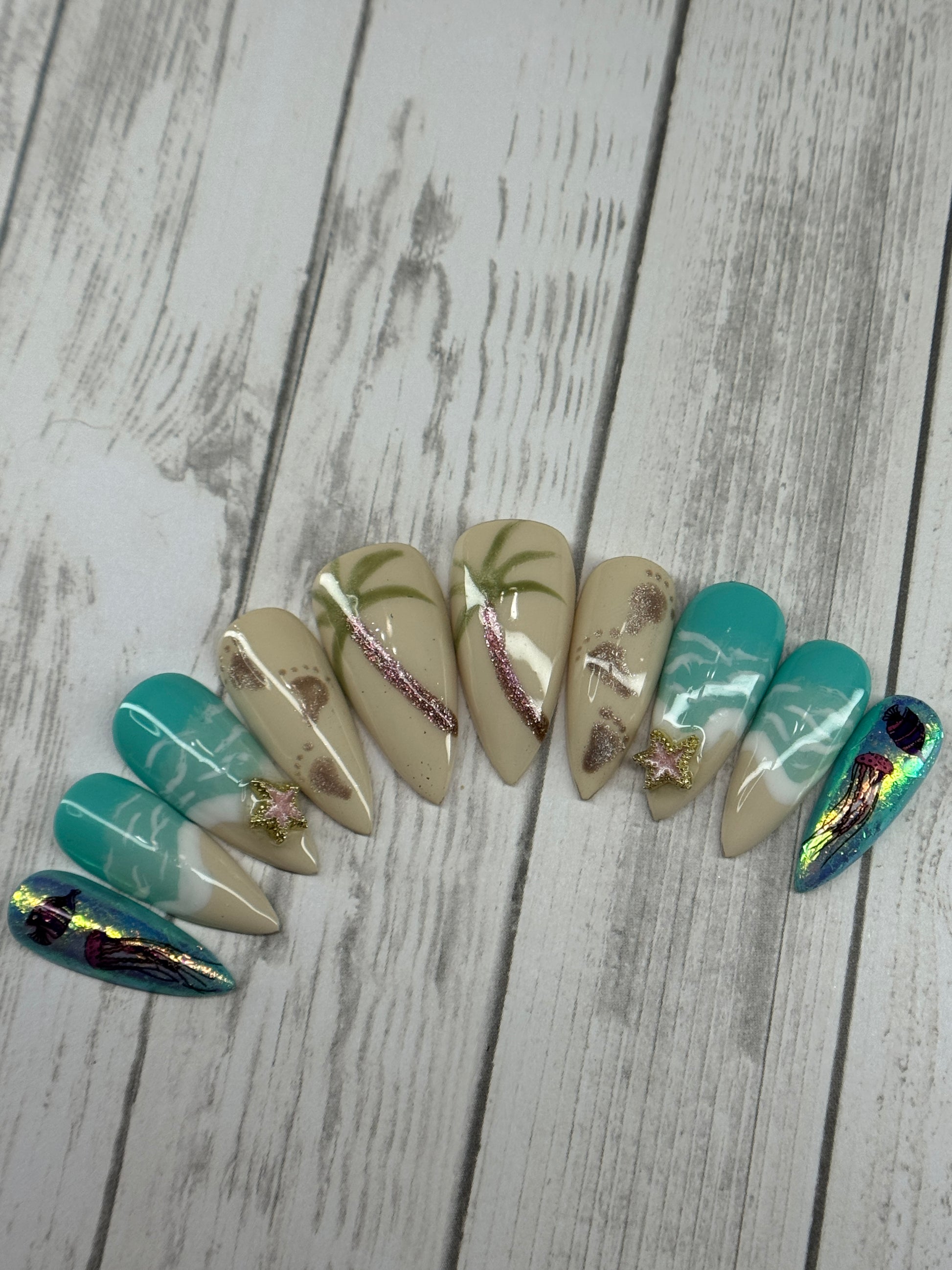 Bring the whole beach to your fingertips with Shore Thing — a tropical press-on set featuring palm trees, wave-like ombré, shimmering sands, and holographic mermaid magic. Complete with starfish charms and glittery details, this set is your ticket to sun-drenched glam without the tan lines.