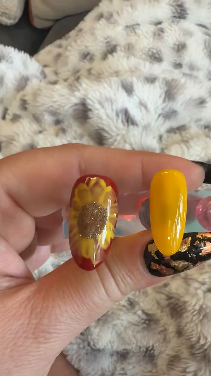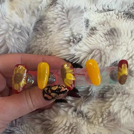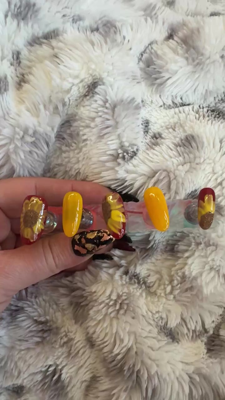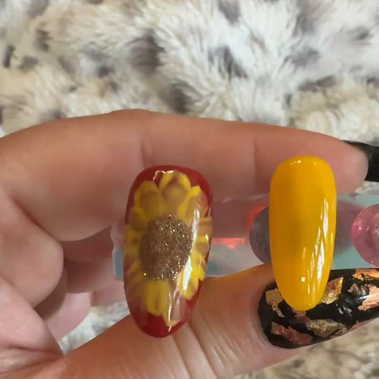 Finish: Glossy yellow + red blend with velvet sunflower detail.